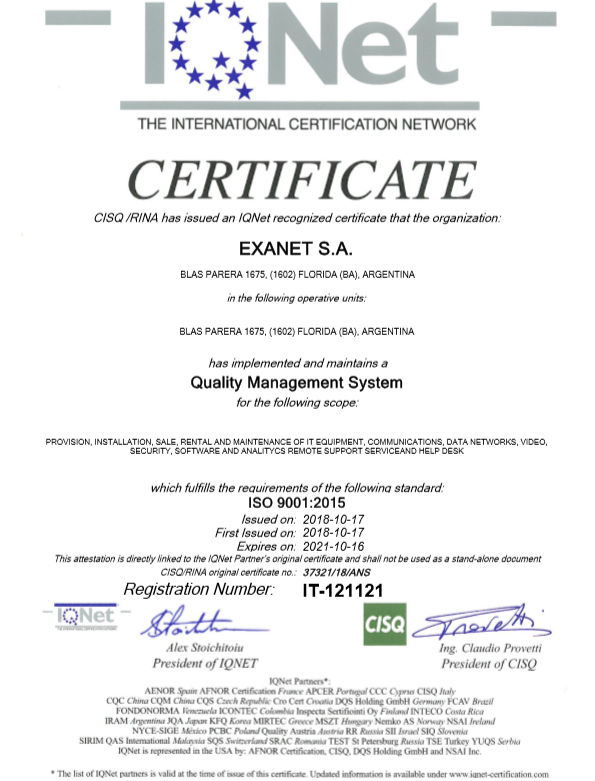 Implementamos y mantenemos, un sistema de administración de calidad que cumple con la norma ISO 9001:2015 para el siguiente campo de actividades: PROVISION, INSTALACION, COMERCIALIZACION, ALQUILER Y MANTENIMIENTO DE EQUIPOS PARA EL RUBRO INFORMÁTICO, COMUNICACIONES, REDES DE DATOS, VIDEO, SEGURIDAD, SOFTWARE Y ANALITICOS. SERVICIO DE SOPORTE REMOTO Y MESA DE AYUDA.